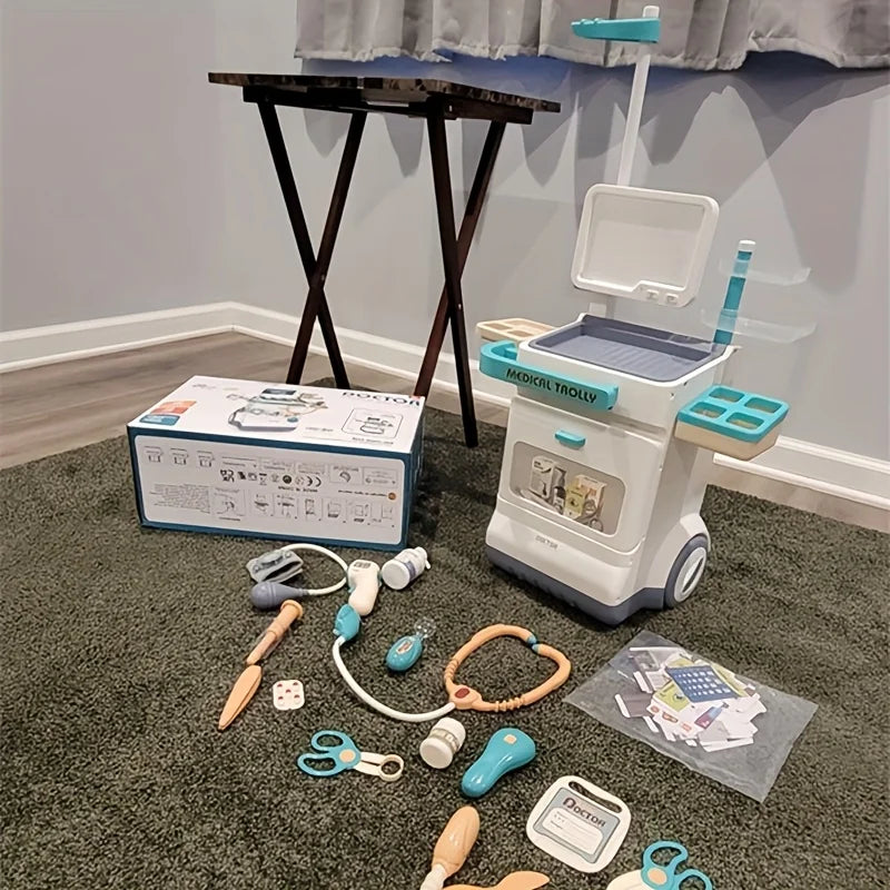 - 26-piece medical station for immersive pretend play and role-playing medical scenarios.