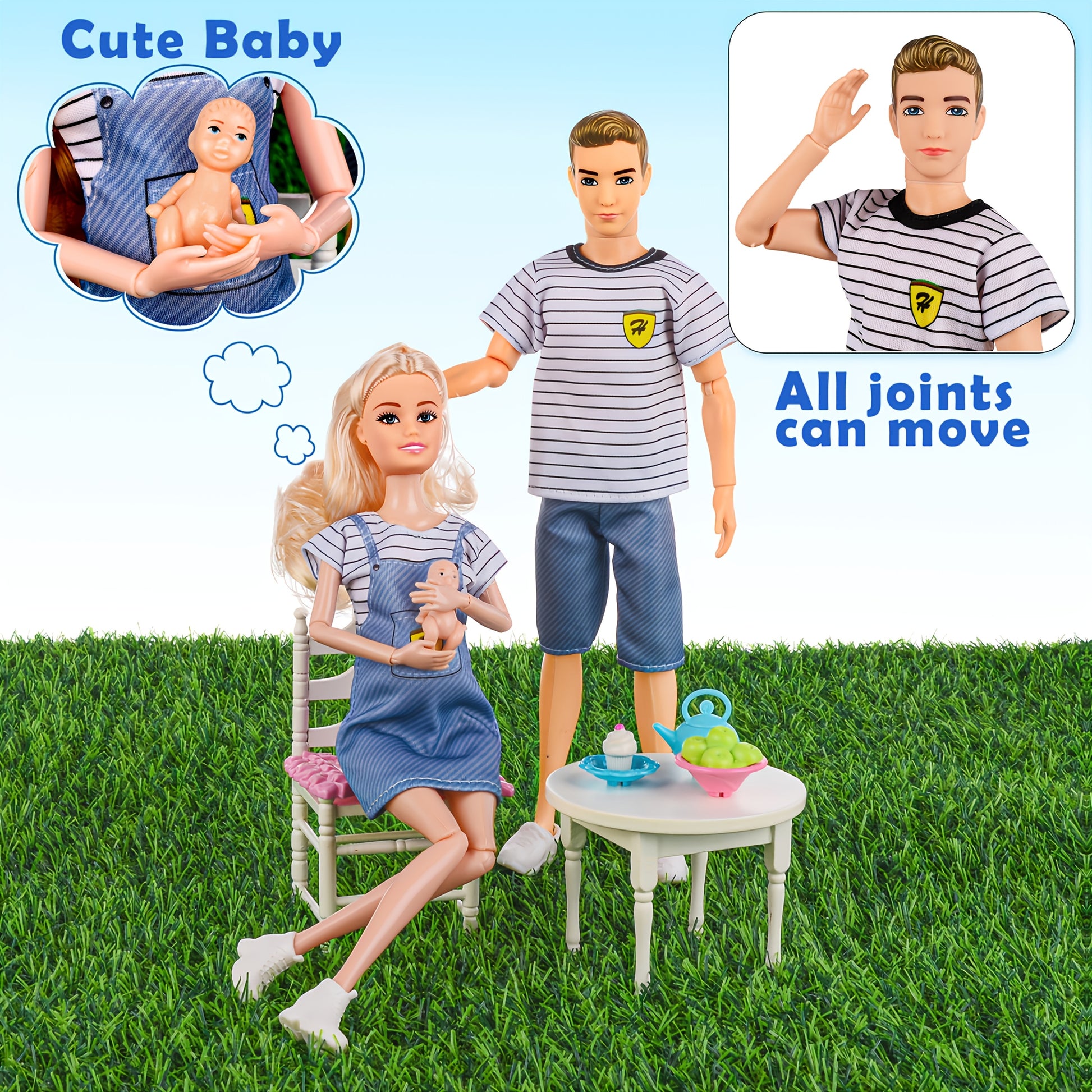- Includes: 1 pregnant doll, 1 father doll, 2 daughter dolls, 1 son doll, 3 puppies, 1 big dog, a handcart, and more accessories