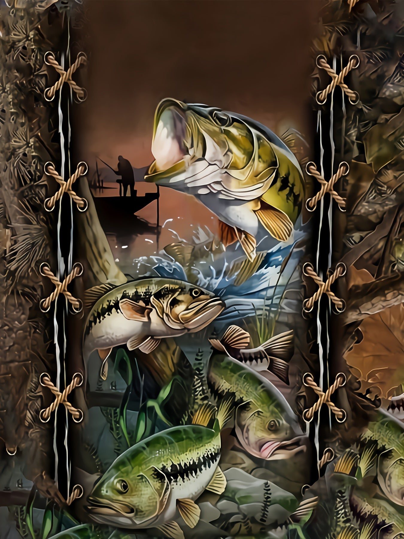 - Design: Graphic bass fishing print with a patterned, random printing style for a unique look.