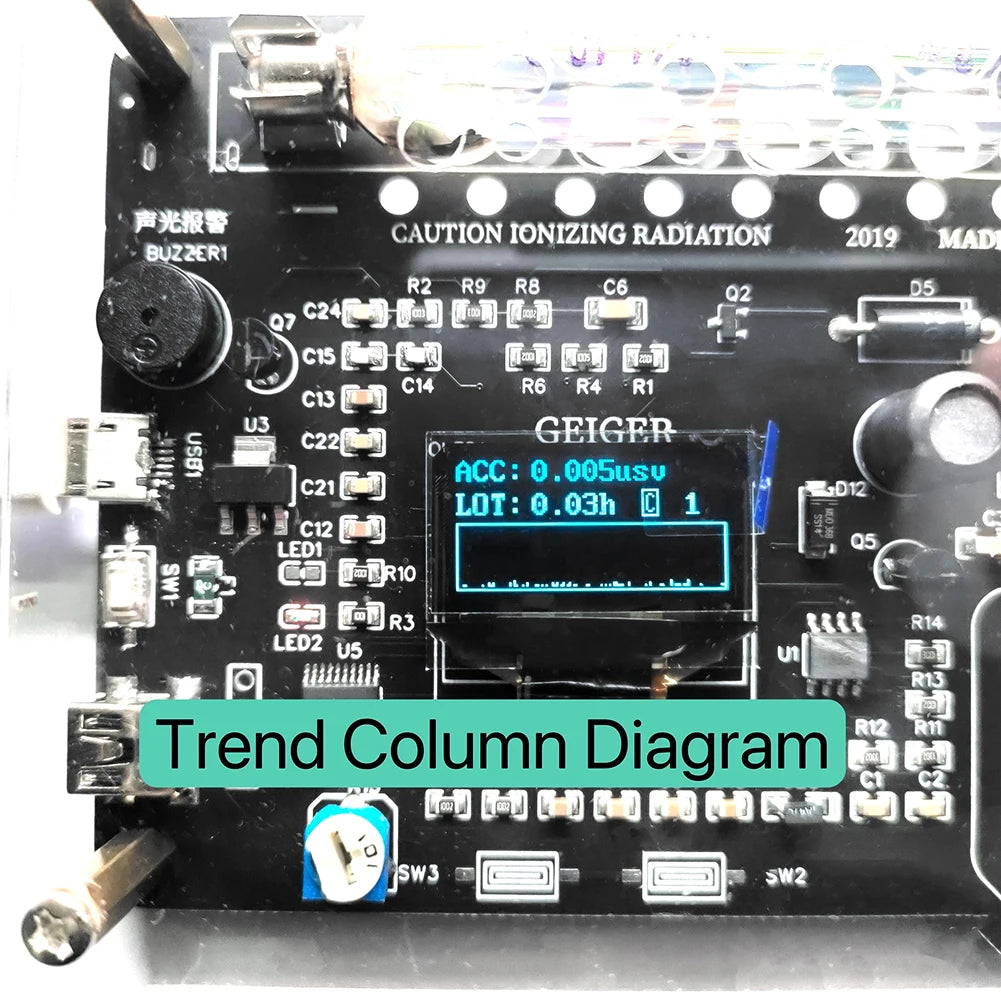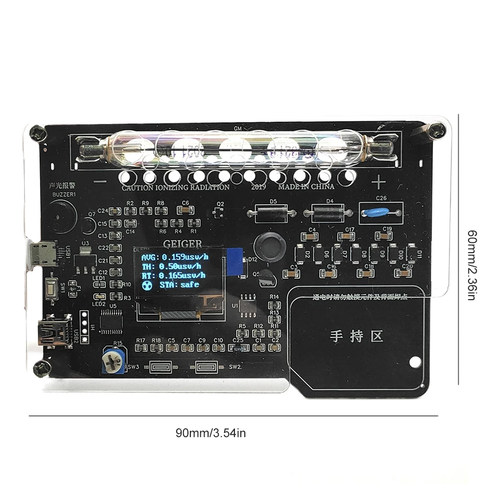 Radiation Tester DIY Geiger Counter Kit OLED Display DIY Geiger Counter Circuit Board Parts with Sound Light Alarm Assembled DIY Geiger Counter Kit Gamma Beta X Ray Lodine 131 Detecting Feature: 1. Dual Alarm Modes: This geiger counter kit module features both audio and visual indicators, ensuring timely alerts and notifications.Stay informed and alerted with our nuclear radiation detector's dual alarm modes. The built-in audio and visual indicators provide immediate feedback, keeping you aware of potential radiation levels. 2. Multi-function Tool: Equipped with real-time dose rate, average dose rate, cumulative dose rate, and trend graph functions, this assembled diy geiger counter kit offers comprehensive radiation monitoring capabilities.Gain full control over radiation monitoring with our multi-functional nuclear radiation detector. It provides real-time dose rate measurement, calculates average dose rates, records cumulative dose rates, and displays trend graphs for a comprehensive understanding of radiation levels. 3. OLED Display Screen: Featuring a compact OLED display screen, our geiger counter circuit board kit delivers clear and precise measurement readings, allowing for easy data interpretation.Experience the convenience of our detector's OLED display screen. Its compact size ensures clarity in displaying measurement results, enabling you to easily read and interpret radiation data. 4. Fast Detection: Powered by an ARM processor, our assembled radiation detector module achieves rapid calculation speeds and robust processing capabilities. Advantage from fast and efficient radiation detection with our detector. The integrated ARM processor enables quick calculations and powerful data processing, ensuring swift and accurate measurements. 5. Wide Range Applications: Suitable for detecting X-rays, gamma rays, and beta rays, our miller tube nuclear radiation detector board is ideal for measuring radiation levels in various materials such as marble, jade, imported products, iodine-131, and unknown minerals.Explore versatile applications with our nuclear radiation detector. It can effectively detect X-rays, gamma rays, and beta rays, making it suitable for analyzing radiation levels in different materials such as marble, jade, imported products, iodine-131, and unidentified minerals. Specification: Certification: NONE Origin: Mainland China J321 pipe specification: Diameter: 0±0.5mm Total length: 90±2mm Starting voltage: <350V Recommended working voltage: 380V Minimum Ping Length: 80V Maximum flat slope: 10%/80V Limit working voltage: 550V Maximum background count rate: 25 times/min Service life: >1x109 pulse Test: Gamma Beta X RayRadial Specification: Material: Printed Circuit Board Geiger tube: j321 (compatible with M4011) Screen resolution: 128*64 MCU:ARM Display accuracy: 0.001usv/h Detection display range: 0-9999usv/h Power supply: USB, 5V, ≥500mA Board size: about 90.00x60.00x20.00mm (3.54x2.36x0.79inch) Note: |